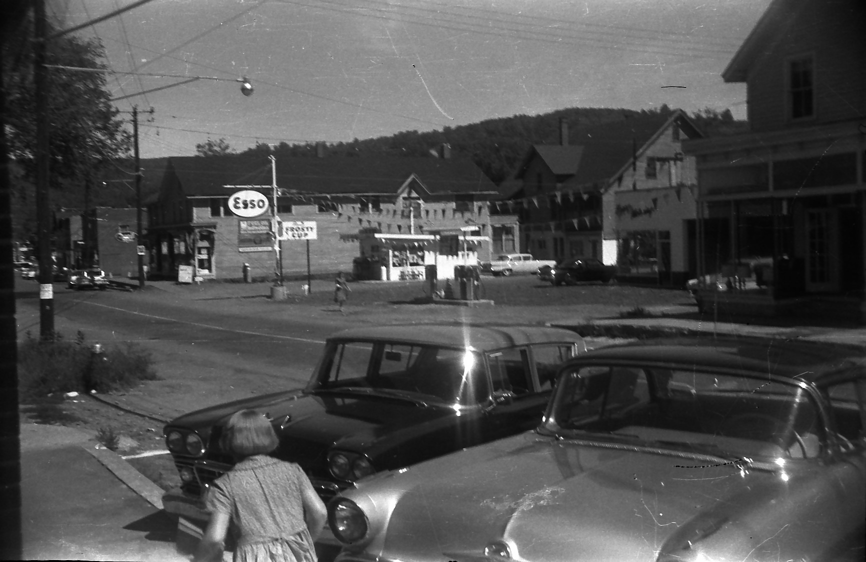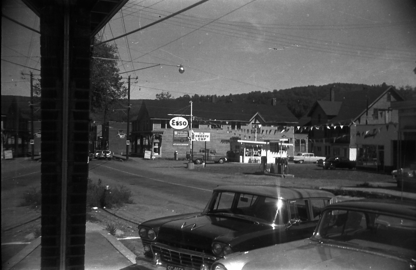 View from the Town Clerk's Office in the Post Office building. Ed's Esso, Frosty Cup and DuBois store in the back